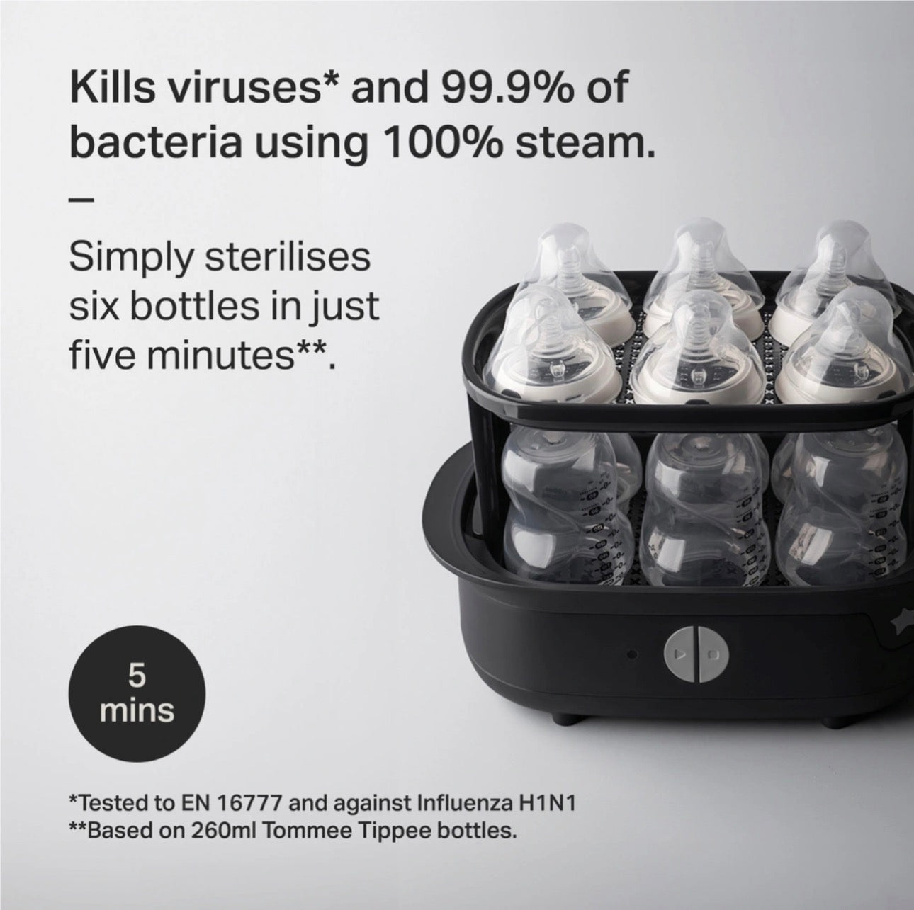 - Electric Steam Steriliser: Sterilise up to six bottles in just five minutes without the use of chemicals to protect baby from harmful germs